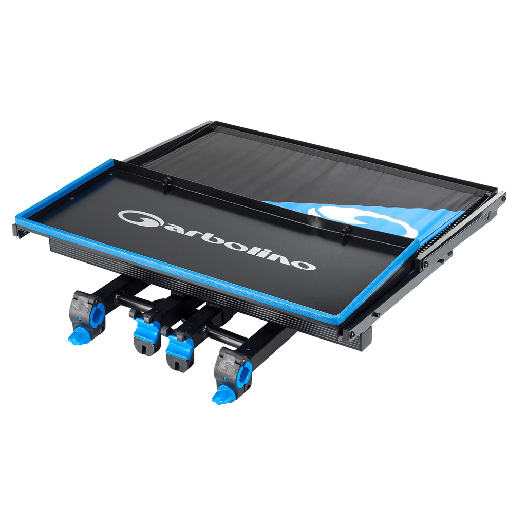 La desserte intègre une tente au design SQUADRA, en noir et bleu, avec le logo Garbolino. Elle protège efficacement les appâts contre les intempéries. Les rebords reçoivent une protection en caoutchouc bleu. Les arêtes sont renforcées par des bandes PVC, pour plus de durabilité et une finition soignée.